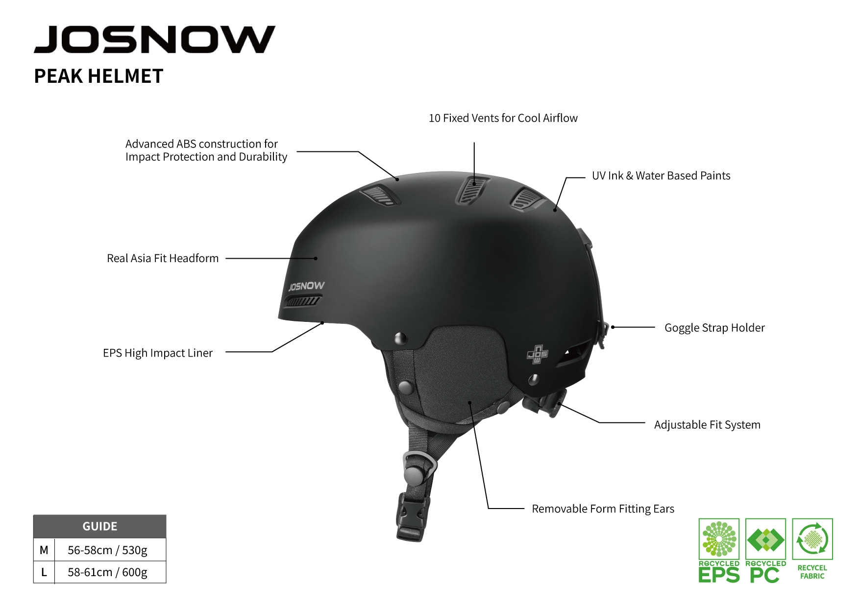 JOSNOW PEAK Helmet reflects JOSNOW’s core philosophy of professionalism, durability, safety, and comfort. Simple, solid, and refined, it’s the helmet designed for riders who value both performance and style. The PEAK Series features an advanced ABS outer shell engineered for enhanced impact resistance and long-term durability. A 10-vent fixed airflow system promotes consistent ventilation, while the lightweight, high-density EPS inner shell provides reliable shock absorption and protective performance. Designed with REAL ASIA FIT, the helmet offers a precise and comfortable fit tailored specifically for Asian head shapes. A refined micro-adjustment fit system, combined with removable ear pads, enhances overall stability and comfort—allowing skiers to stay focused and secure on the slopes. Manufactured in collaboration with an international leader in eco-industry, the PEAK Collection is fully certified to meet CE EN 1077 Class B safety standards, delivering trusted protection without compromise.