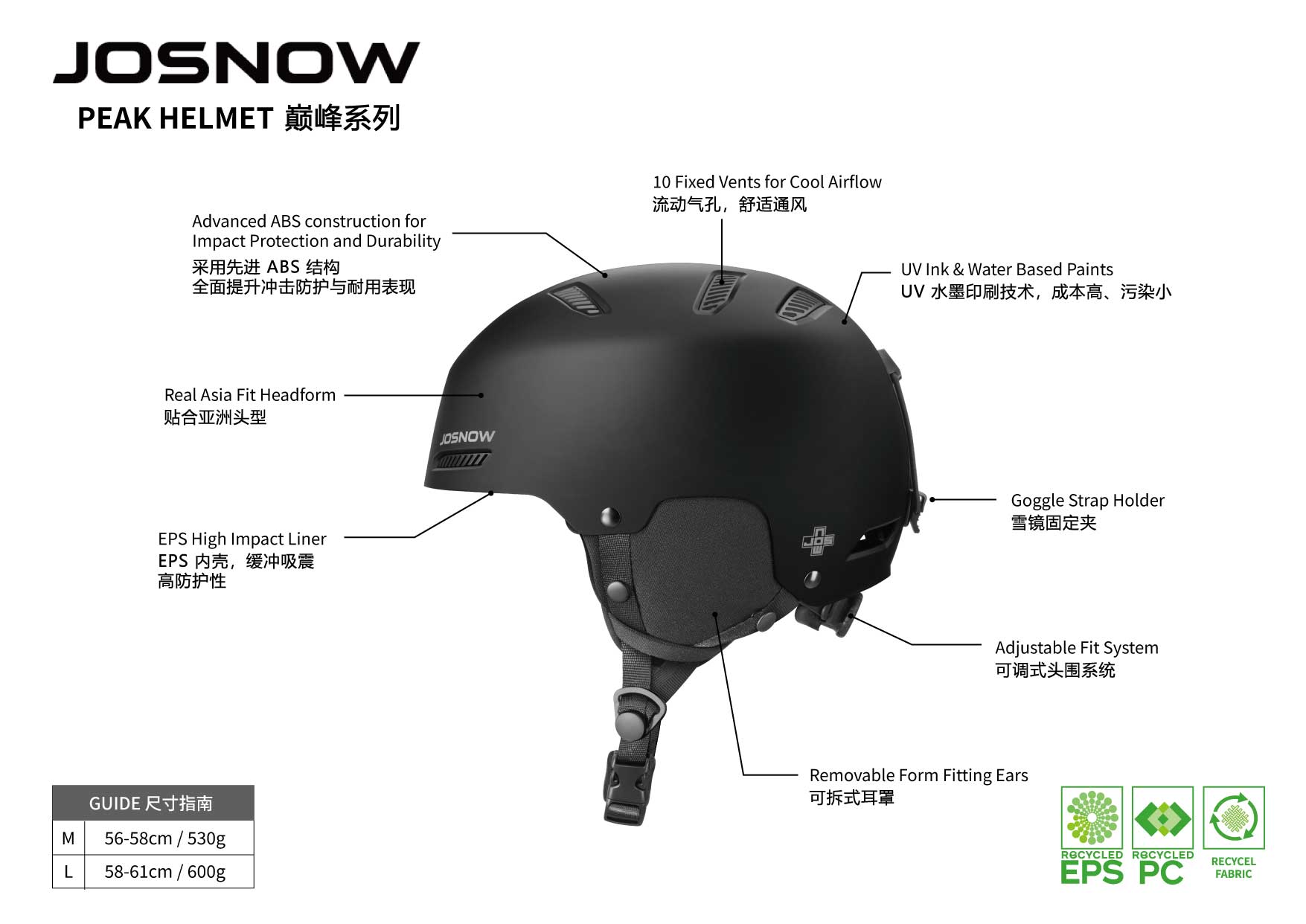 PEAK Collection 由 JOSNOW 携手国际环保材料大厂共同制造,全系列头盔皆通过 欧盟 CE 最高标准认证,兼顾安全性与品质保证。