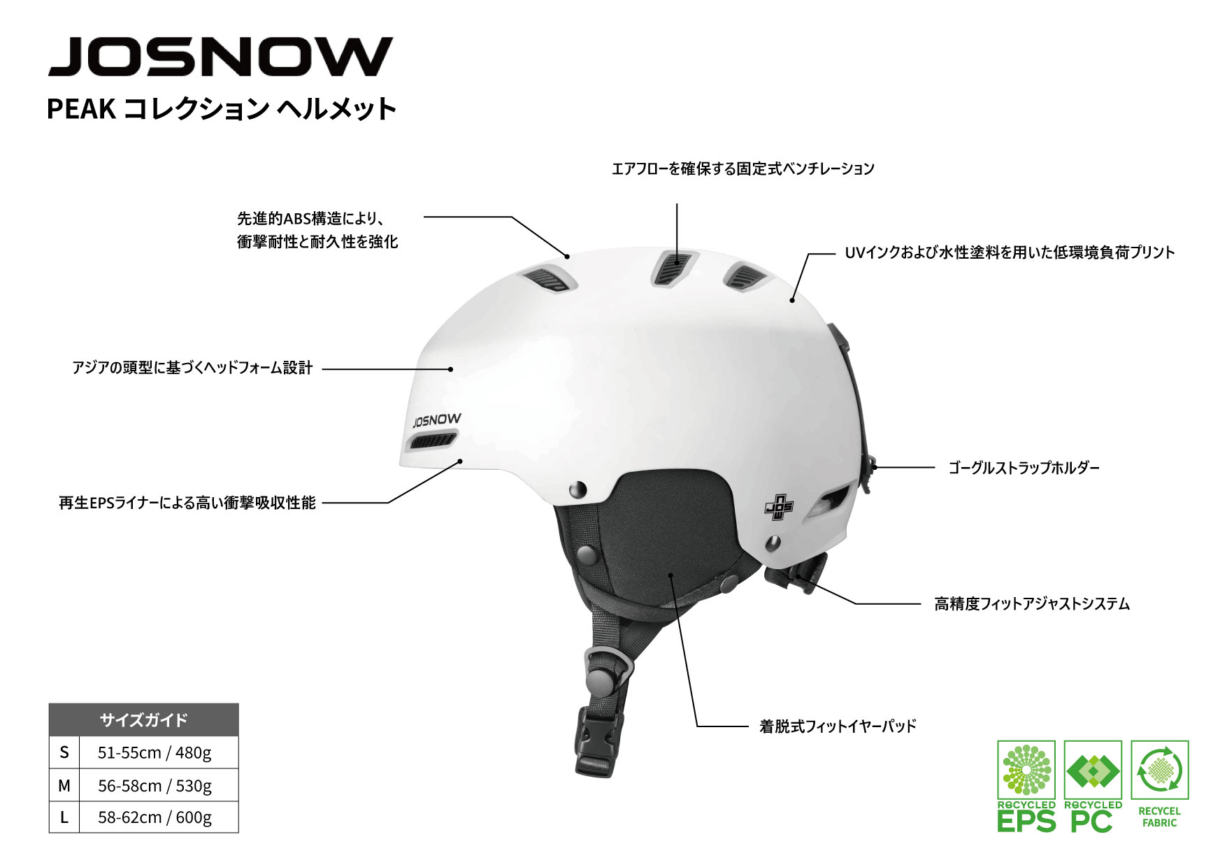 PEAKコレクションは、JOSNOWと国際的な環境配慮型メーカーとの協業により開発・製造されています。すべてのヘルメットは欧州安全規格CE認証を取得しています。