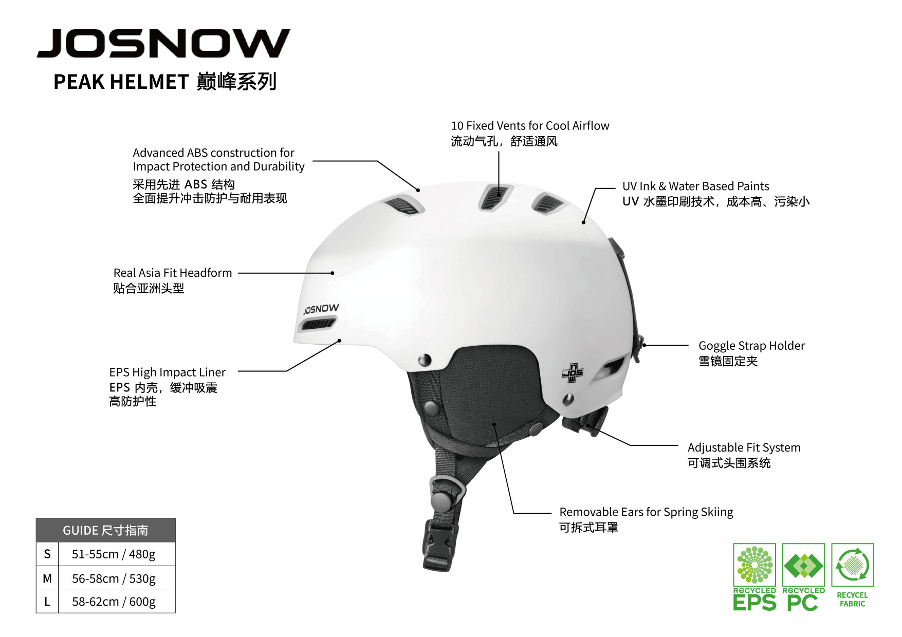 PEAK 系列是JOSNOW和国际环保大厂合作制造,所有头盔皆取得欧盟CE标准认证。